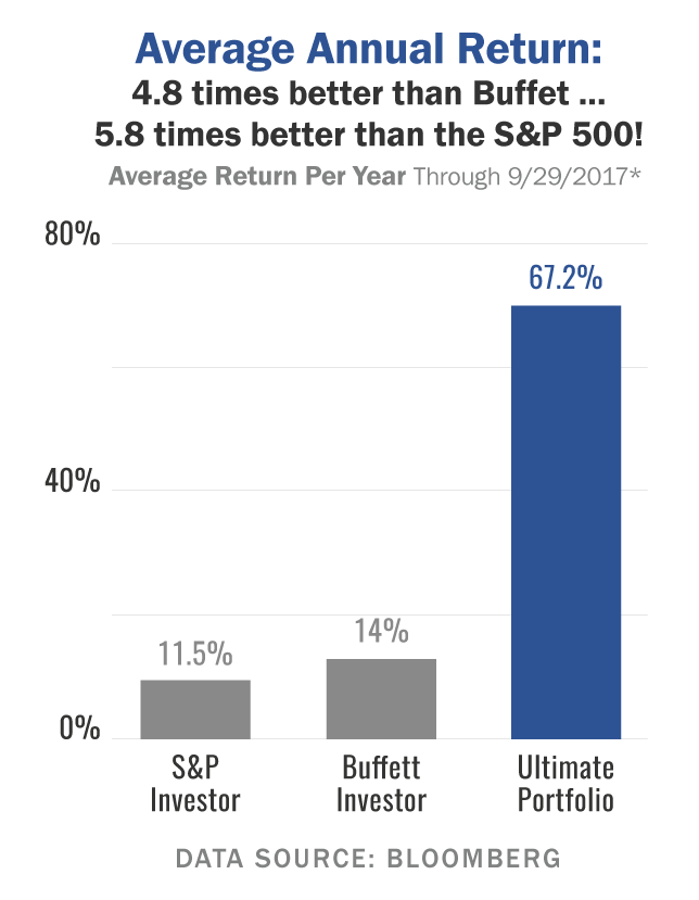 The S&P investor could have made 11.5% per year; the Buffett Investor, 14%; and the Ultimate Portfolio investor 67.2% per year.